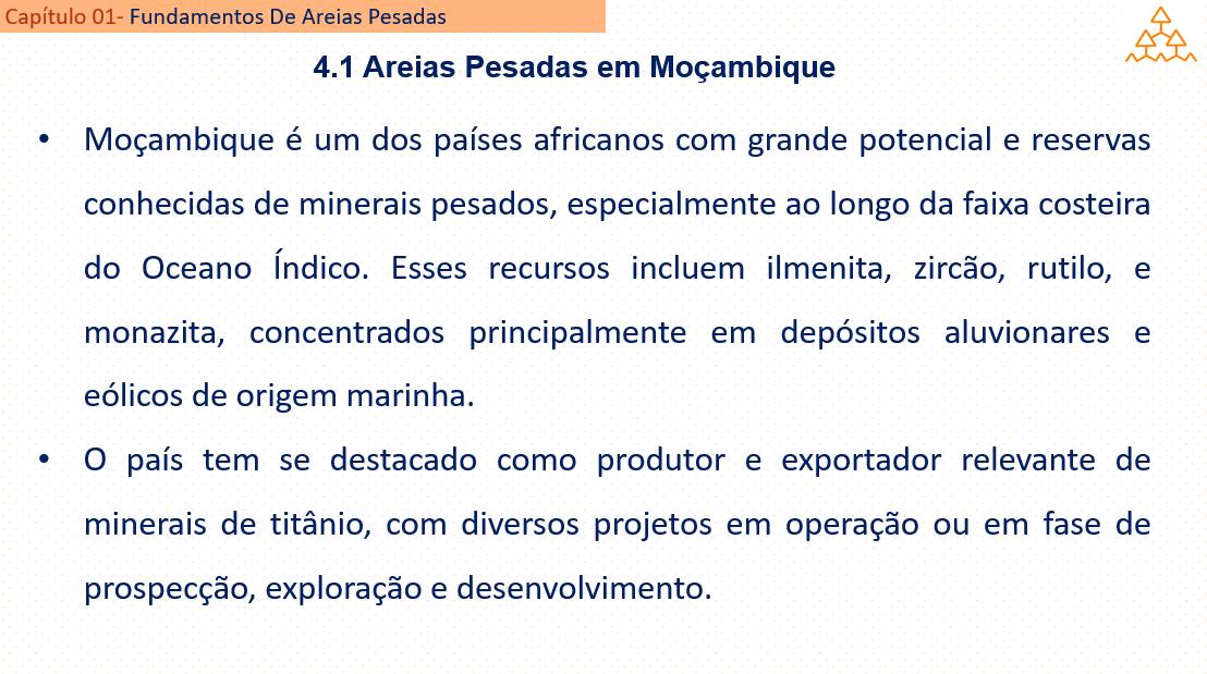 Apresentar aos participantes uma visão geral do setor de areias pesadas, destacando sua relevância econômica, as principais aplicações industriais dos minerais envolvidos e o funcionamento da cadeia produtiva, da extração ao mercado.