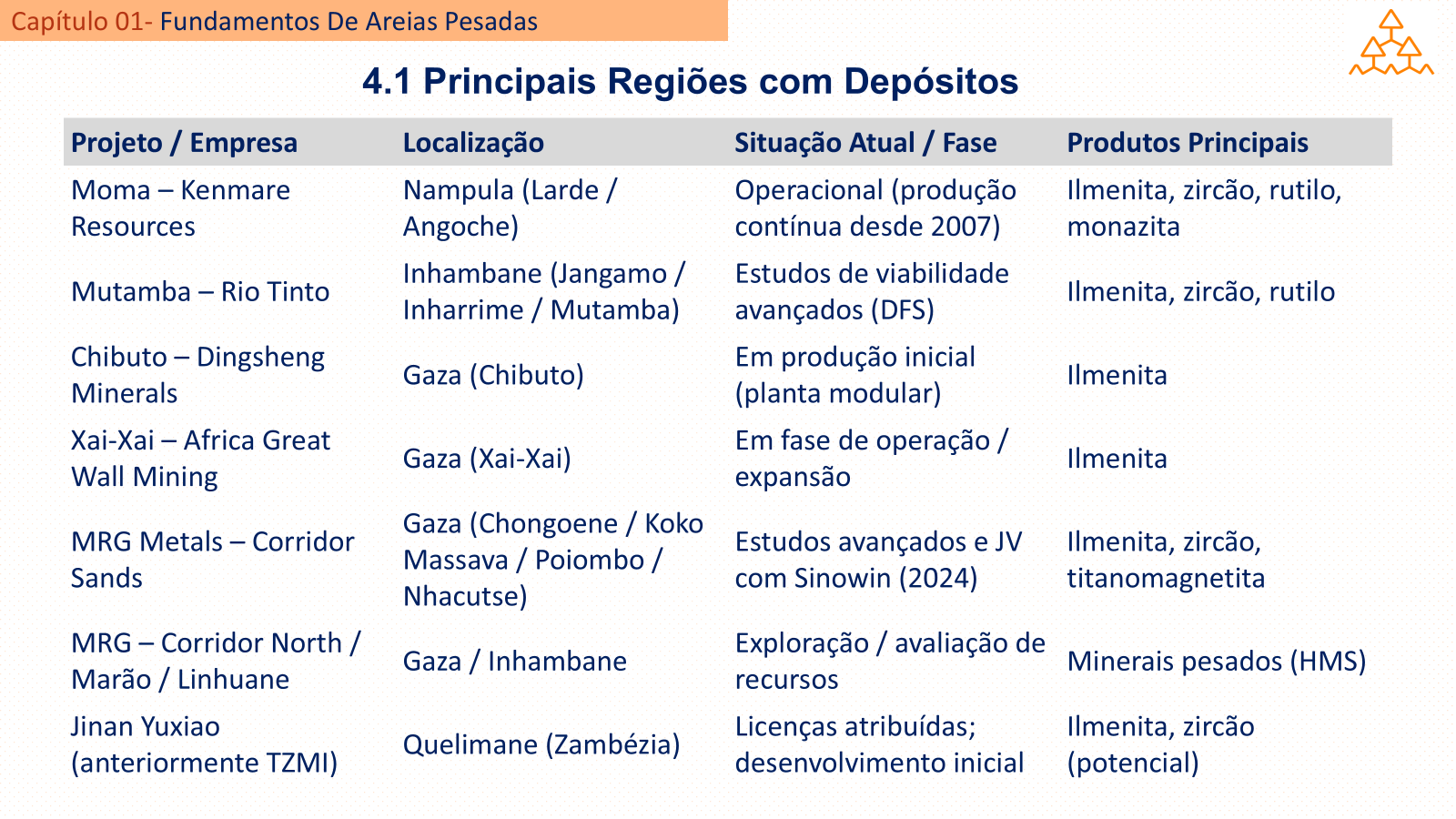 Apresentar aos participantes uma visão geral do setor de areias pesadas, destacando sua relevância econômica, as principais aplicações industriais dos minerais envolvidos e o funcionamento da cadeia produtiva, da extração ao mercado.