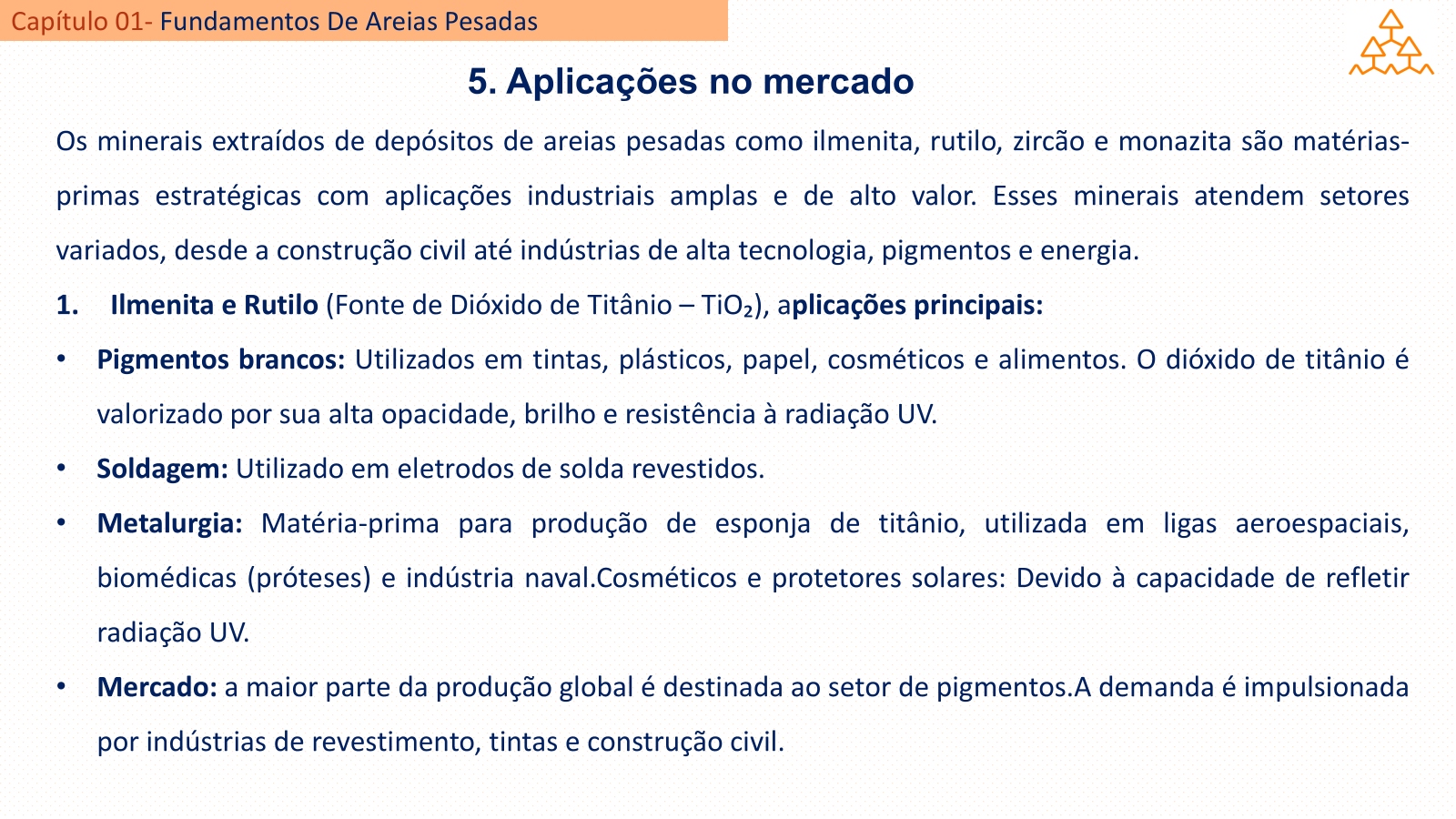 Apresentar aos participantes uma visão geral do setor de areias pesadas, destacando sua relevância econômica, as principais aplicações industriais dos minerais envolvidos e o funcionamento da cadeia produtiva, da extração ao mercado.