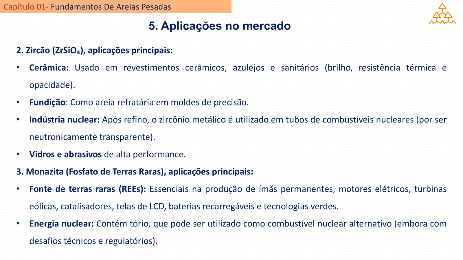 Apresentar aos participantes uma visão geral do setor de areias pesadas, destacando sua relevância econômica, as principais aplicações industriais dos minerais envolvidos e o funcionamento da cadeia produtiva, da extração ao mercado.