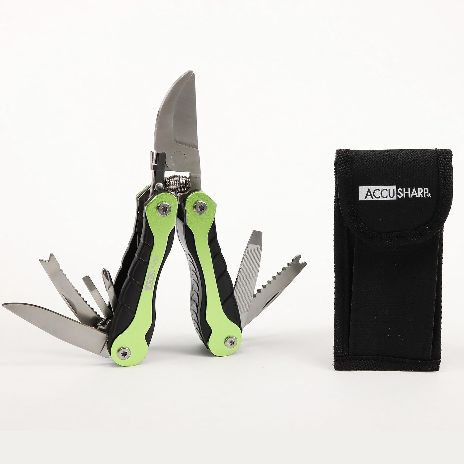 AccuSharp All-in-One Sharpener & Pruning Shears Multitool Bundle - All Purpose Sharpener for Knives, Garden Tools, and Scissors - 10-in-1 Multipurpose Garden Clippers with Screwdriver, Saw, Knife, Rul