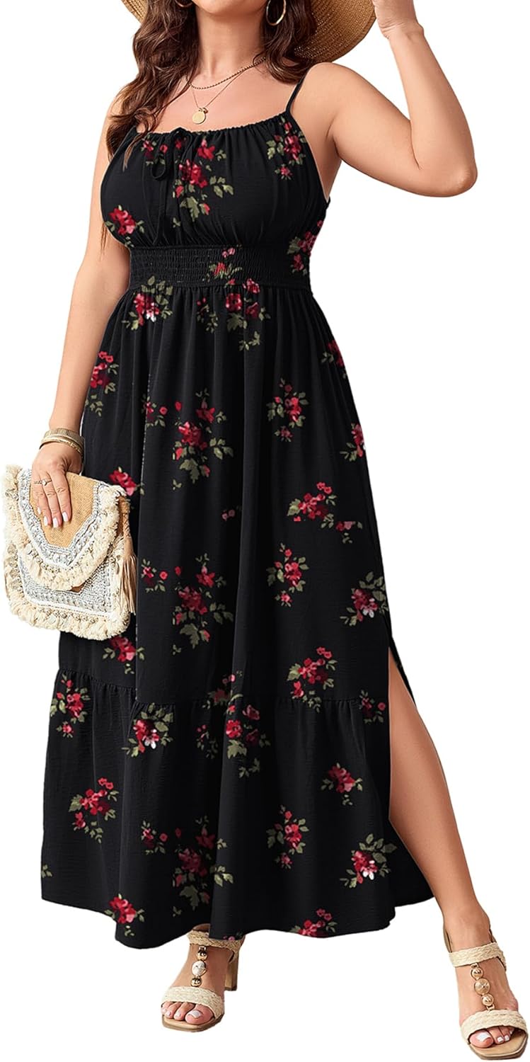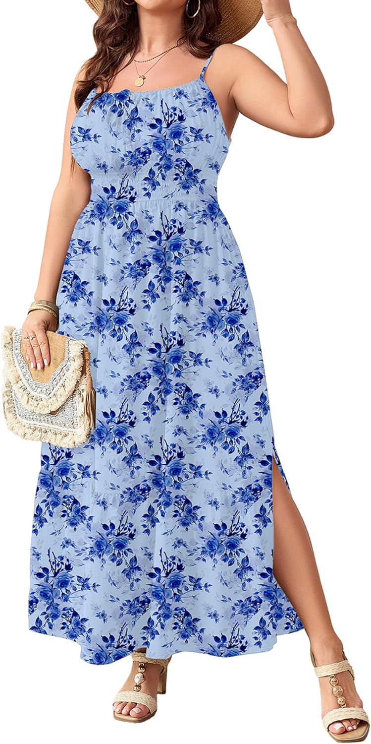 SCOMCHIC Plus Size Summer Boho Dresses Spaghetti Strap Sleeveless Casual Sundress Smocked Flowy Slit Beach Maxi Dress